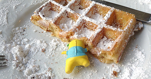 ブリュッセル・ワッフルは生地に甘さはないので、粉砂糖やチョコレート、生クリーム、フルーツなんかを乗せて食べるものなしなー。