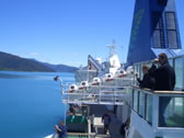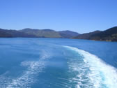 White wake of the ferry in Marlborough Sounds. The Marlborough Sounds has 1500km's of coastline and there were lots of tourist attractions, dolphin watching, fishing and sea kayaking...etc.