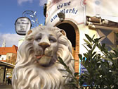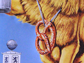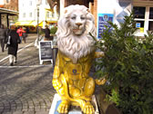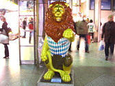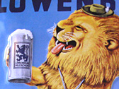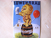 A lion wearing a necklace of pretzel, drinking Loewenbraeu with a happy look!