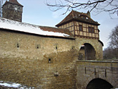 Walking from the station to the town center along Ansbacher street will take you to one of the town gates, "Roedertor". It is located on the east side of the old town of Rotenburg and it's the closest to the station. It was about 10 minute walk form the station. It was built in the 14th century. There are gatekeeper's lodges on both sides of the gate and in medieval time, they were used as custom office. The center photo above shows the bridge over the moat which surrounds the town.