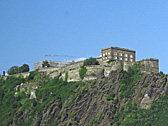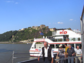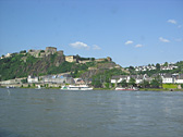 When you can see a huge building, like a castle on the hill, you will soon arrive at Koblenz's boat pier. It isn't a castle, it's the fortress called "Festung Ehrenbreitstein". It's one of the largest fortresses in the world.