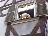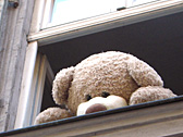 I got tired from walking and I went back downtown. I felt someone's eyes on me and I sort of looked up. There was a teddy bear at the first floor window looking down on me!! I'm sure I must be totally exhausted.