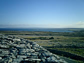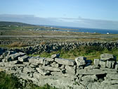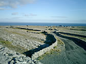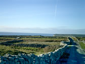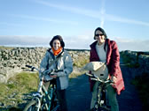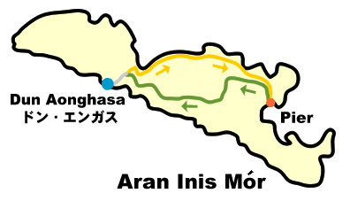 First, we went to Dun Aonghasa, which is the most famous tourist attraction there. According to a map which we got at the rental bicycle shop, there were 2 choices. One was the 'Easy course (orange line)' which followed a road along the seaside. The other was the 'Hard course (green line)' which passed through the center of the island. We were all young except me! And so we chose the 'Hard course'.... 15 minutes from the port, we reached the forked road between the two courses. "Ah-, they chose the hard course!!" |