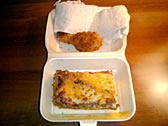 right:This is my last supper in Ireland. Fried chicken and Lasagna, which I bought at the convenience store, with a scone which I got at a baker's shop. Although I had been wanting to eat fresh vegetables during my stay, I chose them unthinkingly....