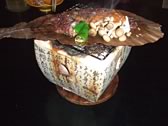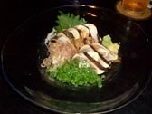right: Katuo-no-tataki/Seared sliced bonito. It is a local dish of Kochi prefecture. It was dressed with sliced onions. finely-chopped long green onion, sliced garlic and special soy sauce. I thought the seasoning was a little different from Kochi.