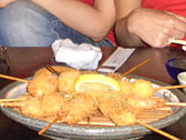 Kushi' means 'bamboo stick' and 'age' means 'deep-flying' in Japanese. Typical ingredients are vegetables, mushroom, pork, chicken and other meats, and seafood etc. Because we ordered Mixed Kushiage, we didn't know what they were until we ate them. It was like lucky dip!