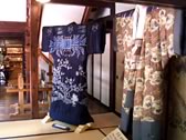 left, center, right: Special quilt cover, 'Yo-gi' . These were used for the guests of Aoyagi family. They were cloth-shaped quilt covers and they had long sleeve. Inside was a cotton material and they looked like a funny long down-jacket.
