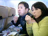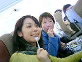 It took about 1 hour to check in and go through departure control and security. Because the internation terminal was very crowded with passenger and people seeing someone off. In addition, WD got stopped at security again and again. He had to take off his shoes and his belt and it took a lot of time. WD was accused by the two of us!!! We killed time and waited for the boarding announcement at the Gate. After a while, we heard the boarding announcement but WD was not there! Apparently, he had gone to a bathroom! The other passengers were boarding and the two of us were left. Fright attendants said, "Please board the airplane." "One of my friends isn't back from the bathroom yet." "Could you go and get your friend?" "It is men's toilets." "...We suggest that you waite here."