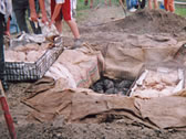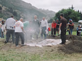 They were cooking a Maori traditional dish, Hangi. First they dig a hole and bury some vegetables, meats, potatoes and hot stones. Then they cover and have a fire on the hole and steam the food.