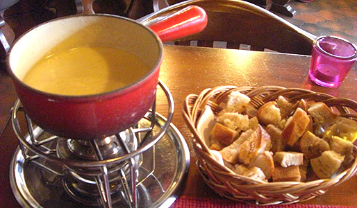The best known Swiss speciality for Japanese people is probably cheese fondue. It is a kind of Swiss home cooking consisting of a blend of heated cheese, white wine and seasoning.