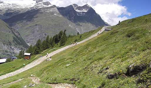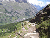 After taking a beer break, I started to walk again to Rifelalp(2220m). Before long, the trail turns down ward on a steep zigzag path. After rain, you might tumble down the hillside if not careful!