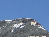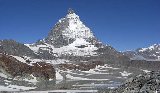 Looking at its right shoulder carefully, you can also see a mountain lodge,"Hornlihutte". It is well-known as the nearest base camp to access the Matterhorn from the Swiss side. During the summer months, the Hurnlihutte offers a nice restaurant and it bustles with hikers. However, areas above Hornlihutte are limited to seasoned climbers!