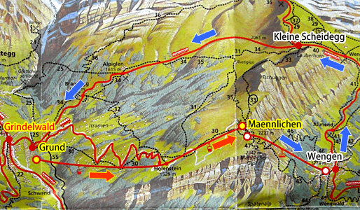On the way back to Grindelwald from Wengen, you have to change trains at Kleine Scheidegg from the Wengernalpbahn(WAB) to the Berner Oberland Bahn(BOB).