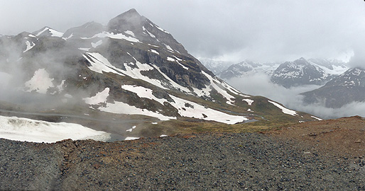 Unfortunately the mountain peaks were totally covered with heavy clouds and it was very windy, and looking out the cabin window, it seemed to me that a storm was brewing. I gave up on going to the top of the mountain and I got off the cable car at the intermediate station, Schwarzsee(2520m). Schwarzsee(2520m) was popular as a starting point for all levels of hikers but it was also in the clouds which hung low....