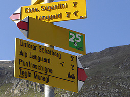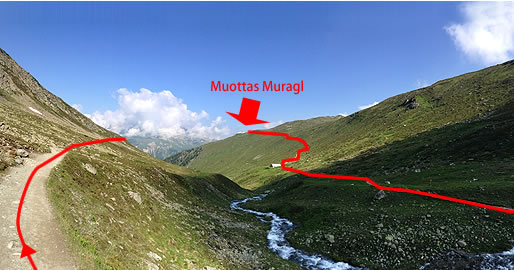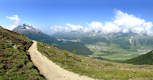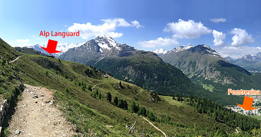 The easier one is called "Muottas Muragl Panorama Trail" and its length is about 7km. The trail leads towards a mountain stream and then it stretchs around the mountain(Schafberg) to the chairlift station at the top of Alp Languard.