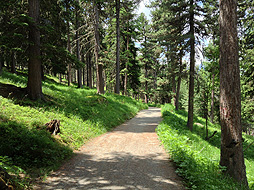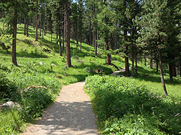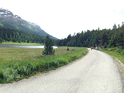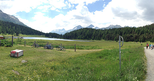 After walking for one hour along the trail through the woods. I came to the edge of small pong "Lake of Staz(Lej da Staz)". There were lots of people who were enjoying the sun, lakeside picnics and swiming.