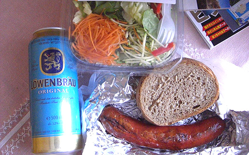 A takeaway sausage from the sausage stand, canned beer and a packed salad from the co-op supermarket.