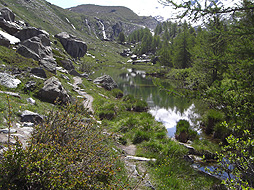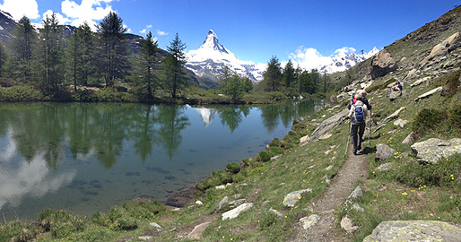 Walking along the trail with your back against the Matterhorn, after a while you'll reach one of the 5 famous lakes, Gruensee.