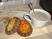 ■フィンランドのパン / Karjalanpiirakka 葉っぱの形のライ麦のパンでフィンランドのパンです。中に牛乳粥みたいなものが入って、どっしり重くて食べごたえがあります。 ある日の夕食・・・です。 【メモ】 パンとスープ 2.7ユーロ(約430円) ※箱入りスープ含む