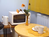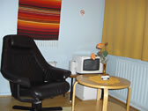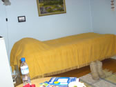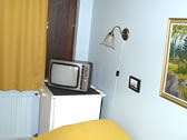 ■シングルの部屋 お風呂とトイレは無いんですが、鏡&手洗い場があって便利でした。歯磨くのにいちいち外に出なくていいし。部屋にはベッド、電子レンジ、簡単な食器類、冷蔵庫、時代を感じるテレビ、妙に立派な椅子がありました。テーブルにはお花まで飾ってあって・・・滞在中邪魔なんでずっと隅っこの床の上に置いてましたが(スイマセン)。