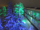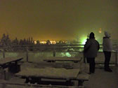 屋上からの眺め。ホテルの横には小さいゲレンデがあり、ナイターの明かりがある。9時過ぎぐらいにはナイターが終わり真っ暗になるとのことで、待ちましょう。