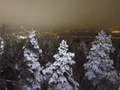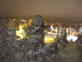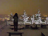 タクシーで15分ぐらい、丘の上のにあるホテル到着。建物の脇に屋上までの外階段があり、そこを登ってみる。階段は半年霜とりしていない冷凍庫状態、すべる・張り付く・・・非常に危険ですので、お気をつけて。一瞬、手すりに舌をくっつけてみたい衝動に駆られるが、大人なんでなんとか我慢。