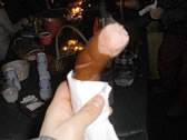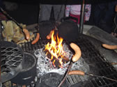 ちなみに、フィンランドの巨大ソーセージは、木の棒に刺して焚き火であぶります。この木の棒は、ホストの方の手作りだそう。棒を燃やさないよう、ソーセージを焦がさないよう、絶妙の距離を保ちつつあぶっていきます。が、これがなかなか難しい。早く食べたい・・・まだか?まだか?もう焼けてんじゃない?他のお客さんとワイワイ楽しく焼いていきます。結果、フライングした私のソーセージ(写真右)、半生でした(笑)。 |