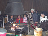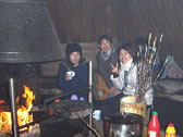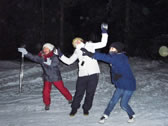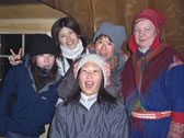 そこで、この三人の登場です。このツアーでお知り合いになったK嬢、M嬢、さらにMさん。三人揃って「オーロラ踊り」を踊っております。オーロラを呼んでいるそうです(笑)。もちろん、その場しのぎの創作ダンスですが・・・笑わせていただきました。 |