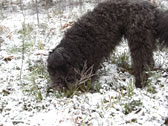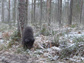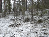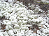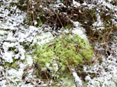 雪のように見えますが、雪というより「霜」という感じ。そして足元はなぜかふわふわしております。「苔」です。つま先で霜をはらうと、鮮やかなグリーンの苔が顔をだします。うーん、こういうのを鹿(?)とか食べているのでしょうか?
