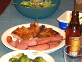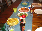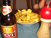 さてお夕食。「わーい、ビールだ、ソーセージだあ」。旨いよ、旨い。芋もプレッシャー無くつまむぐらいなら、美味しいじゃないか。ビールは「OLVI」というブランド。