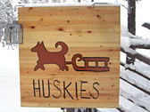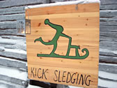 レヴィ・ラップランド村の中。「ハスキー体験」「キック・スライディング(なんかソリみたいなやつ)体験」の手作り看板発見。うーん、味のあるイラスト。