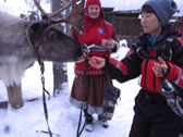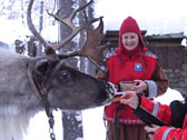 帰る前にトナカイにあって、トナカイクッキーをやってみる。ところで、トナカイは雄も雌も角が生えるんだそうです。雄は春に生え始め秋に落ちる、雌はその反対なんだとか。写真のトナカイさんは角が1つだけ残ってたんで、雄・・・ということか?