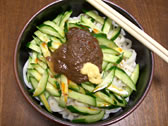 ■CGCの讃岐うどんで強引に作ってみました 「myじゃじゃや麺。」 なんだかなあ。美味しいっちゃーおいしいけども、じゃじゃ麺かと問われると微妙。ゴマだれ冷やしうどんと言う感じか、ゴマ味じゃないけど。