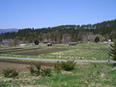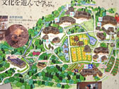 ふるさと村の中。畑や池を囲むように「曲り家」があります。