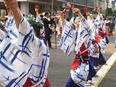写真左/中央:本部追手筋競演場。他に9箇所の競演場、4箇所の演舞場がある。170以上の団体が踊っているので、いつでもどこかの団体が踊っているのを見ることができる。