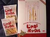 カルビーの北海道限定商品。日本一旨いスナック菓子は?ときかれたら、迷わず「じゃがポックル」と答えたい。モスバーガーぐらいの太さ・形の「フライドポテト状のお菓子」である。歯ごたえ、塩加減、おいもの風味、どれをとっても絶妙のさじ加減。しばしば北海道スキーの帰りに千歳空港で探すものの、いつも「売り切れ」。2年ぶりに巡り会ったじゃがポックル!!合計8箱の「大人買い」ですだ! |
