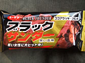 写真/右:某コンビニにて発見、「黒い稲妻 ブラックサンダー 若い女性に大ヒット中」。なんだか人気があるんだそうな。中はただのチョコレートクランチ。 |