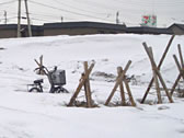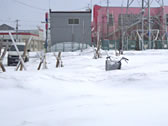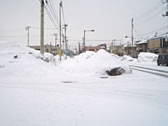 公園にて。雪が溶け、自転車のカゴが見えはじめた。ここに約3ヶ月間埋まっていたということか・・・。60cmぐらい溶けたようだ。 |