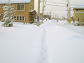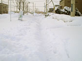 しばらく更新してなかったんで、日付けを忘れてしまいました。テレビでは「新潟」「新潟」と騒いでおりますが、地味に青森も降っております。写真は月曜朝の歩道。道幅20cmほど。当然すれ違い不可。一番初めにここを漕いで進んだ人は誰だろうか。えらい。 |