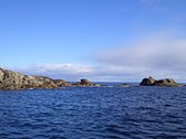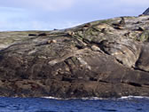 | 約1時間半のクルーズで海際までやってきた。入り江と違い、さすがに波があってちょっと揺れるはじめる。写っている岩場はオットセイのコロニーだそうだ。 |