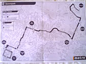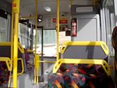 バスの中。黄色のパイプがど派手。路線図と時刻表はシティ・モール近くのバス・エクスチェンジ(市バス営業所みたいなところ)で手に入る。市バスのHPからダウンロードもできて便利。両替機が無いので、あらかじめできるだけ小銭(または小さいお札)を用意しておかないと、「おつり?無いよ。しばらくまっとけ」と言われるよ…。 |