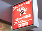 グロースター通りの、ビルの中アーケードの中にある日本食レストラン、というか食堂。めちゃめちゃ安い。「大阪屋」なんてうさん臭っさーと思っていたら、ホントに大阪京橋出身の人が経営しているそうだ。おにぎり、うどん、ラーメン、お好み、焼そば、定食なんでもあり。久々に「うどん」を食べてみたが、ラーメンと兼用っぽいゆで卵がイイ味だしてる。すごく外人顔の店員さんが「豚玉はいりま〜す」と叫んでいたのが印象的。 |