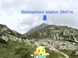 後ろを振り返ると、ベットマーホルン山頂駅が見えるなっしー。山頂はまた雲の中に入ってしまったみたいなっしなー。