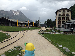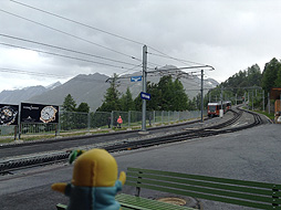 リュッフェルアルプにある高級ホテル前を通り過ぎ、リュッフェルアルプ駅に到着なっしー。ここで雨が降ってきたので、ハイキング終了。ゴルナーグラート鉄道でツエルマットの町に戻るなしよー。