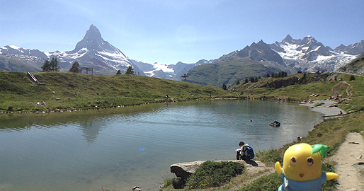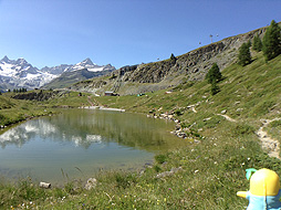 ゴールのスネガ駅のすぐ下にも逆さマッターホルンが見られる湖があるなっしよ。ただ、ここはアクセスが良いことと、泳げる湖なのでいつも騒がしくて、あんまり静かな感じではないなっしー。あんまり期待してはダメなっしー。