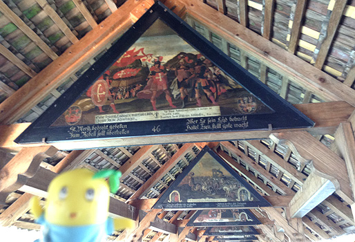 橋の天井付近には、町の歴史が描かれた三角の絵が沢山飾られてるなっしー。