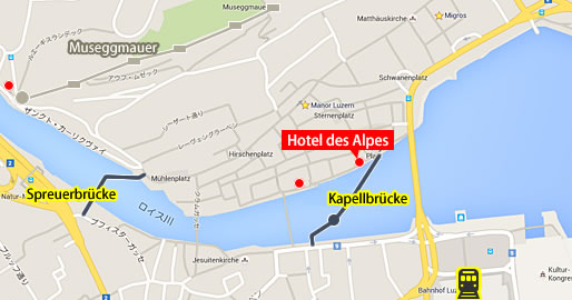 ホテルは、カペル橋の目の前「ホテル デ アルペ(Hotel Des Alpes)」。