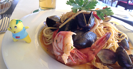 ビール7.5CHF、海の幸パスタ31CHF。チップ込みで合計40CHF(5360円位)。