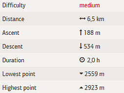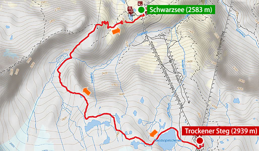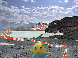 トロッケナーシュテクのゴンドラ駅から「シュヴァルツゼー(Schwarzsee)2,583m」のリフト乗り場までの約6.5kmのハイキングコースなっしー。