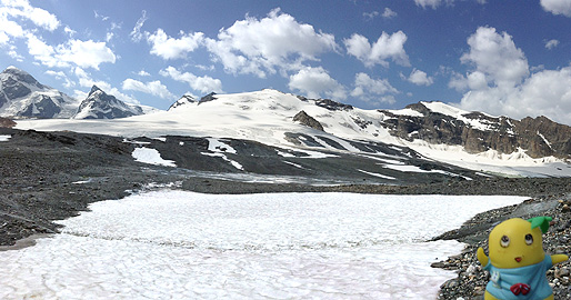 矢印の山が「クライン・マッターホルン(Klein Matterhorn)3820m」、小さなマッターホルンと呼ばれている山なっしー。このあたりは夏でもスキーが出来る場所なっしよ。